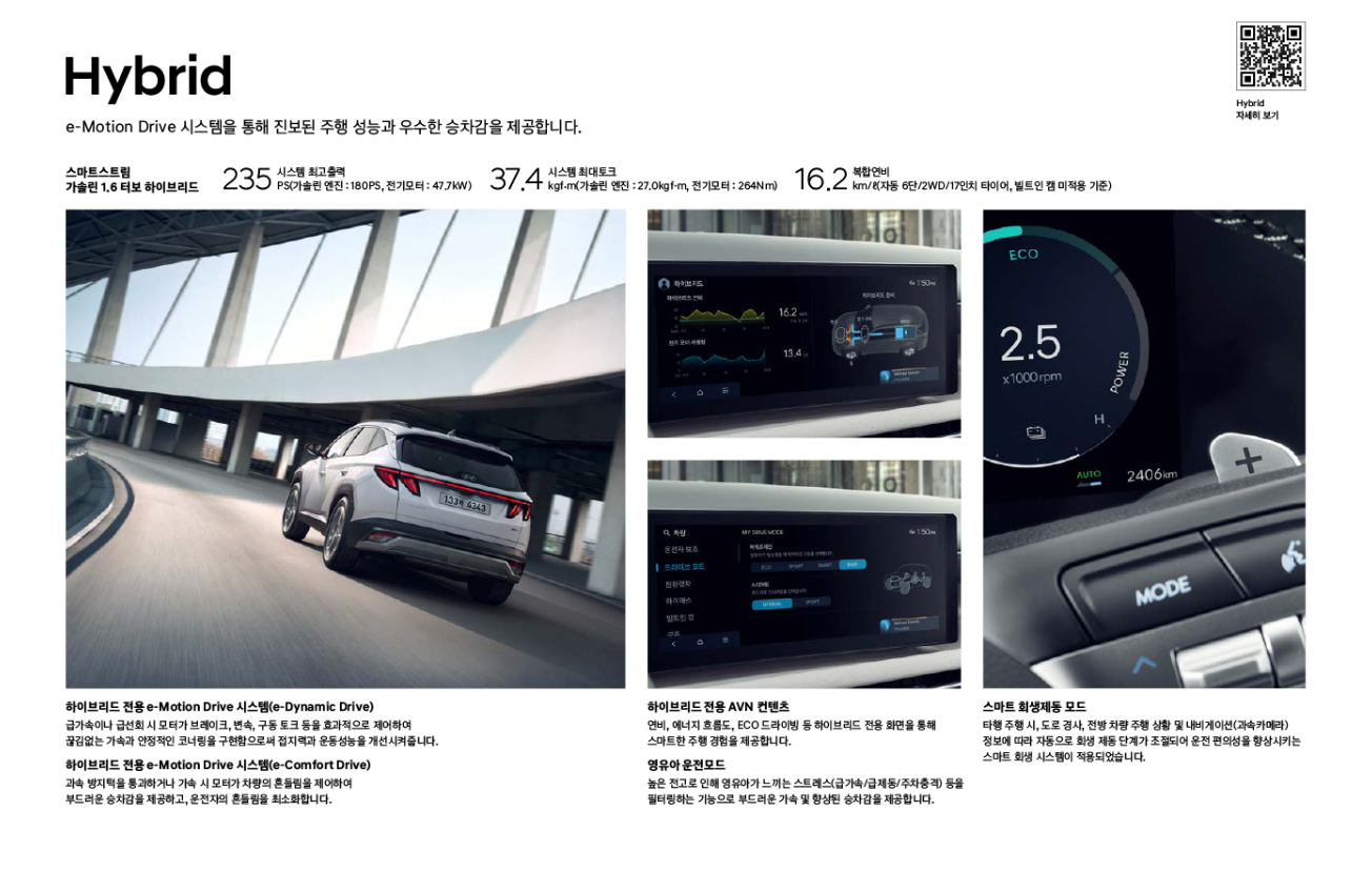2025 투싼 하이브리드는 뛰어난 연비를 자랑해요. 이는 환경 친화적인 선택으로 많은 소비자들에게 매력적일 수밖에 없어요. 또한 강력한 하이브리드 엔진은 우수한 가속 성능을 제공해 주며 다양한 주행 모드 선택이 가능해 어떠한 환경에서도 최적의 주행감을 느낄수 있어요.