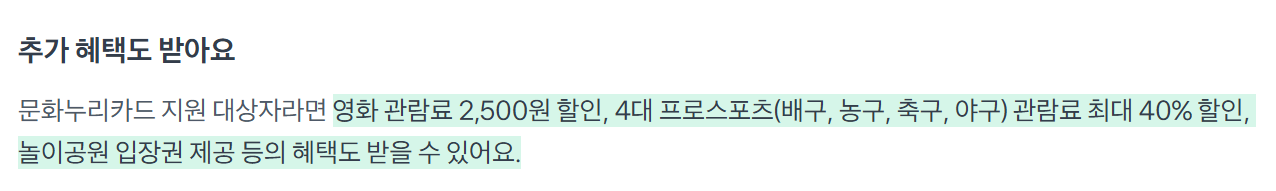 - 일부 놀이공원 입장권 제공(대상 시설은 문화누리 홈페이지에서 확인 가능)